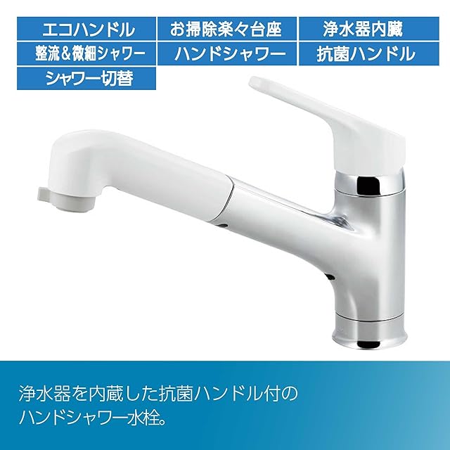【快適で清潔なキッチン回りに】汚れにくくお手入れしやすい抗菌仕様のハンドルや、さっとひと拭きでお掃除できるスカート状の台座によって、水回りを清潔に保ちます。