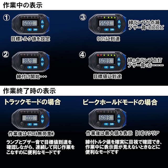 ラチェットギア数:52山、電源:単4乾電池2本、操作モード:ピークホールドモード・トラックモード