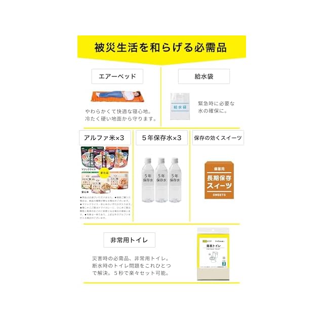 ?【こだわりの防災グッズたち】防災のミカタは実際の被災生活経験者の声を参考に防災士監修のもと、本当に必要なものを選び抜いた非常用持ち出し袋です。避難生活時に情報収集アイテムとしてかかせないラジオ、スマホの充電器。発電式だと時間と体力を消耗して災害時に使いにくいため、すぐに使える乾電池式を採用しています。被災生活を少しでも楽に過ごせるように、エアーベッドを用意。体育館等の固い地面でも快適に過ごすことが出来ます。その他防災リュックの実はここがしんどい、辛いという部分を改善し、快適で安心できるこだわりの防災グッズだけを集結しました。だからこれさえあれば大丈夫!防災のミカタでいざというときに備えましょう! (※セットの内容は商品の入荷状況によって商品パッケージや色が違う場合や、品質が同等の商品で代替対応させていただく場合がございます。)