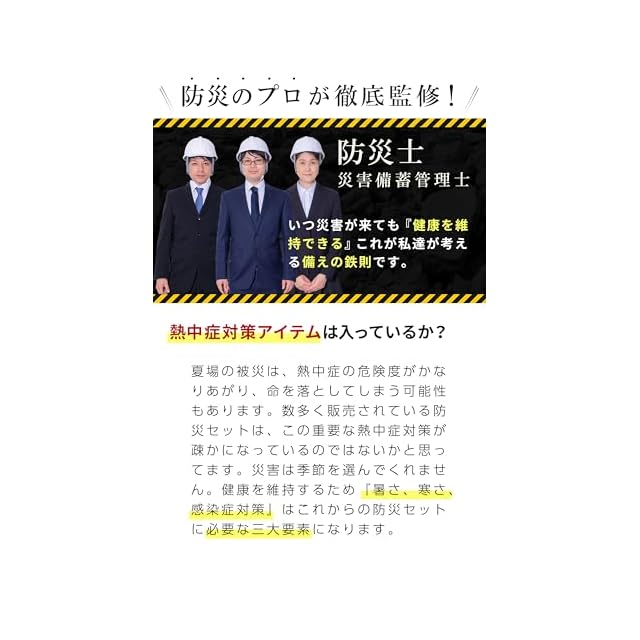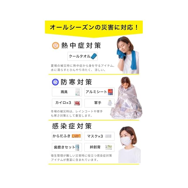 ?【災害は季節を問わずやって来る!】外にいるだけで身の危険を感じる暑い夏に寒い冬。そんな時にもし災害が起きたら・・・。防災のミカタはあらゆる危機を想定して熱中症対策と寒さ対策の防災グッズを備えてます。身を守るために必要なものを考え抜いた精鋭の防災セット、災害時の避難生活は防災のミカタの非常用持ち出し袋にお任せください。
