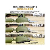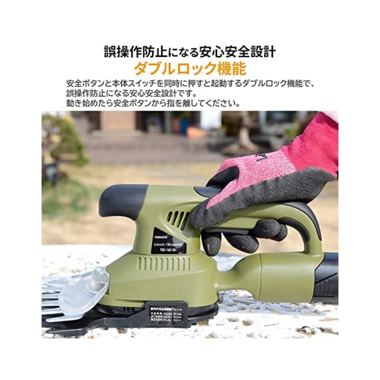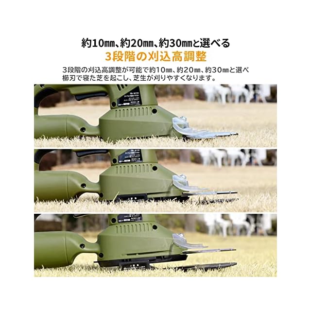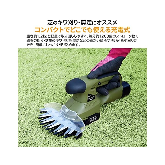【特徴】芝のキワ刈り・剪定にオススメ、コンパクトでどこでも使える充電式コードレス芝生バリカンです。毎分約1200回のストローク数で、簡単にしっかり刈り込めます。刈込高は3段階で調節可能です[約10/20/30mm]。櫛刃で寝た芝を起こし、芝生が刈りやすくなります。重さ約1.2kgと軽量で取り回ししやすく、縁石の周り・芝生のキワ・花壇/壁際などの細かい箇所や狭い所も小回りがききます。安全ボタンと運転スイッチを同時に押すと起動するダブルロック機能により、誤操作を防止します。