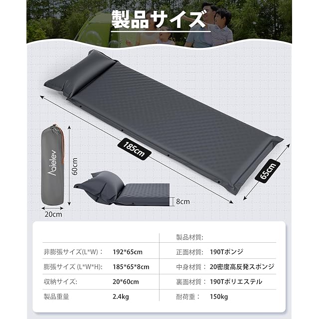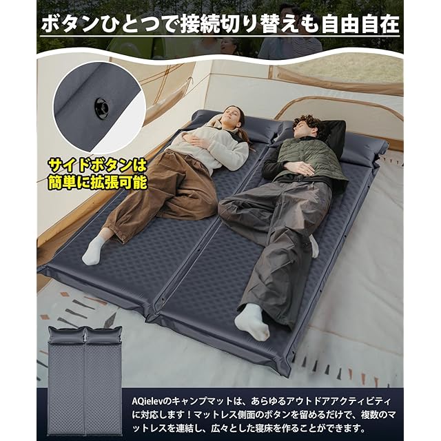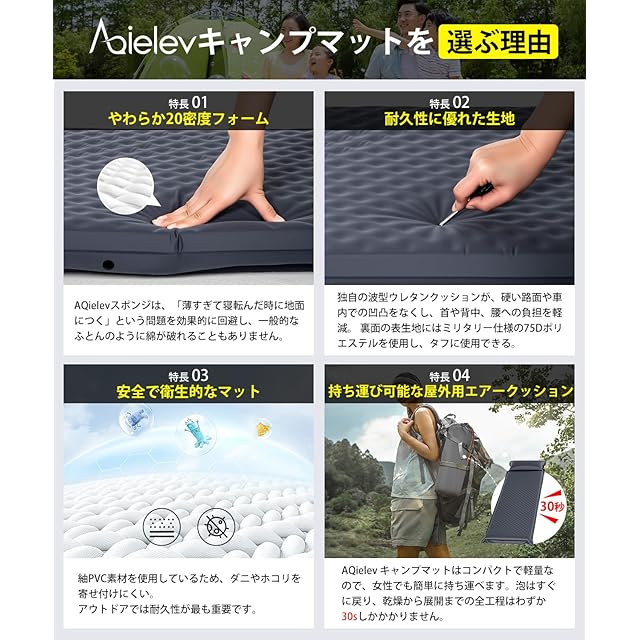 【水や汚れに強いコーティング破れにくいナイロン素材】190TスポンジPVCと耐久性のあるポリエステル繊維でできた空気注入式マットレスは、非常に頑丈で防水性があり、尖った石や枝で破れる心配はありません。大雨の場合、湿ったタオルで拭くだけで内部への水分浸透を防げます。 【安心のアフターサービス1年間の品質】この自動膨張式マットレスは購入後12ヶ月のが付いています。万が一不具合があった場合は迅速に対応させていただきますので、安心してアウトドアをお楽しみください。