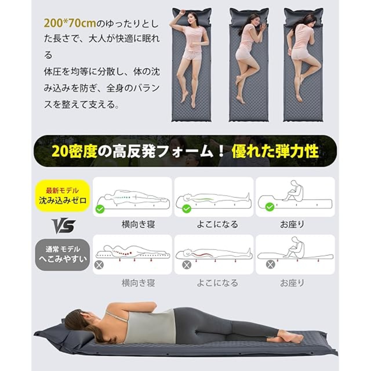 【高密度フォーム層体圧分散】 圧力分散システムの科学的手法に基づいた柔らかいフォーム層で、このキャンプマットは平らでも横向きでも岩場でも均等にサポートし、早朝の筋肉痛を軽減します。また、5,000回の屈曲にも耐えうる耐久性テスト済み!