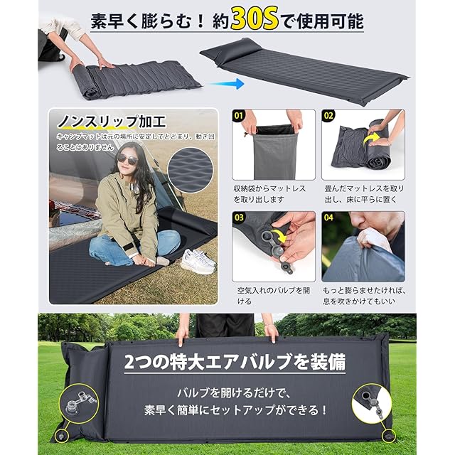 【30秒で膨らむ二重バルブ設計】業界最速の自動膨張システムで、マットレスを必要な場所に平らに置き、バルブを開くだけで、30秒でフルに膨らみます。収納時は専用バルブを開くだけで膨らみ、10秒でコンパクトに折りたためます。アップグレードされたデュアル・バルブ・デザインにより、空気漏れの心配がなく、夜中にマットレスが倒れる心配もありません。さらに膨らませる必要を感じたら、商品下部の画像をクリックしてインフレーターを購入すれば、屋外でも快適に眠れます。