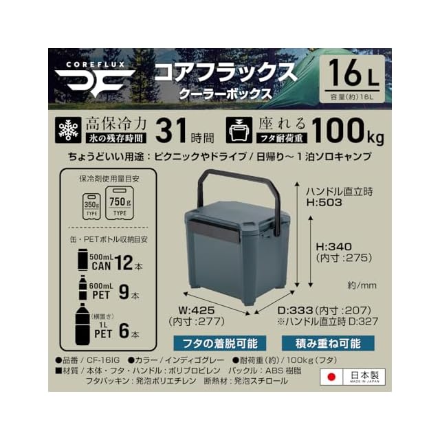 商品名:JEJアステージ 座れる 高保冷力 クーラーボックス COREFLUX (コアフラックス) インディゴグレー 16L 日本製[幅425×奥行333×高さ340mm]レジャー スポーツ 部活 アウトドア キャンプ ピクニック 鍵穴付き お弁当 コンパクト 軽量 釣り 蓋が外せてお手入れ簡単