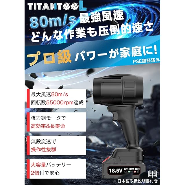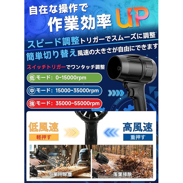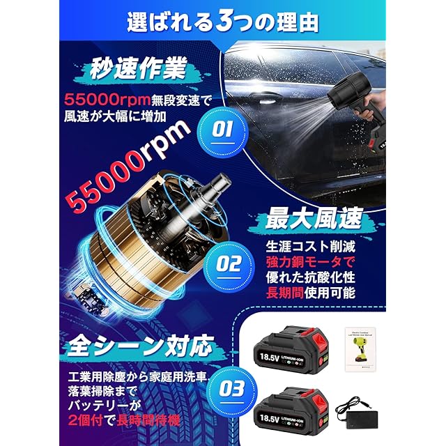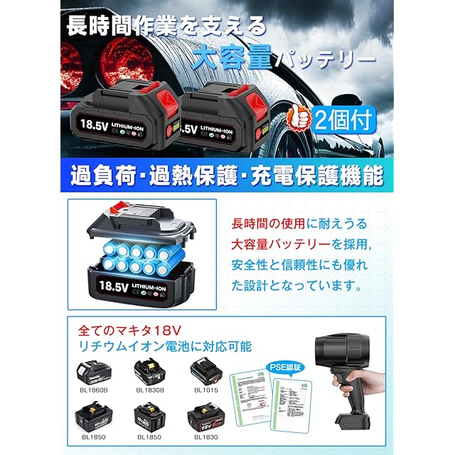 商品名:ブロワー 強力 洗車【新昇級版モデル 】PSE認定 残量表示 バッテリー 2個搭載 55000RPM マキタ電池互換 高速回転 無段階変速 軽量 コードレス ブロワー 80m/s大風速 最強 強力 耐久性 12枚大ファンブレードターボブロワー 高温耐性 小型 庭掃除/落ち葉/洗車/キーボード/パソコン/エアコン/網戸/除雪/フィギュア/バーベキュー 日本語説明書付き