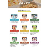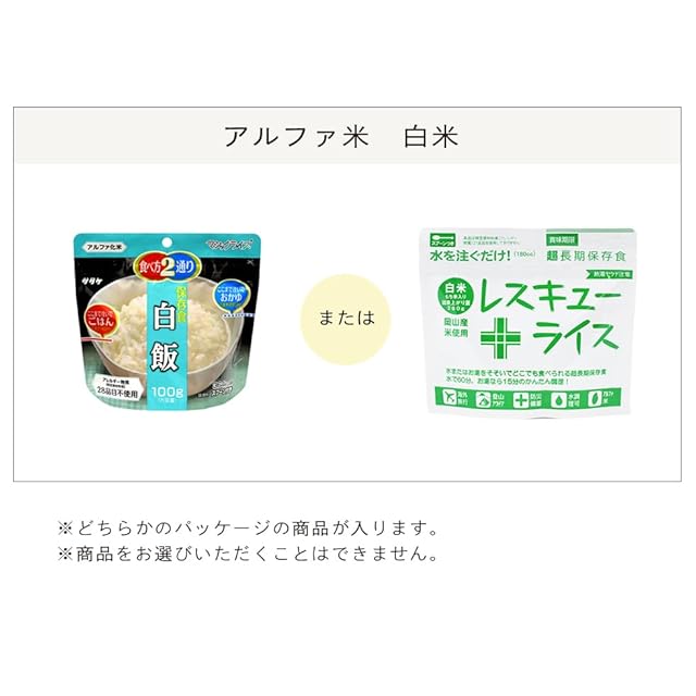 アルファ米:1度炊いたご飯を乾燥させているため、長期保存可能に。お湯か水を適量加えて待つだけで、ふっくら美味しいご飯ができあがります。また、水の量を調節すると、おかゆとしても食べられ、体調に合わせて召し上がれます。