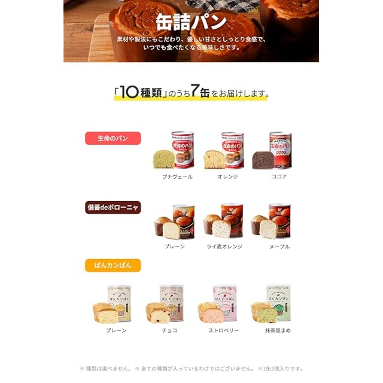缶詰パン:一般的に”缶詰パン”といえば、ぼそぼそしているイメージですが、セレクトした缶詰パンは違います。素材や製法にもこだわり、優しい甘さとしっとり食感で、いつでも食べたくなるおいしさです。また、10種類のうち7缶をランダムでお届け。どの缶詰パンが届くかお楽しみに。