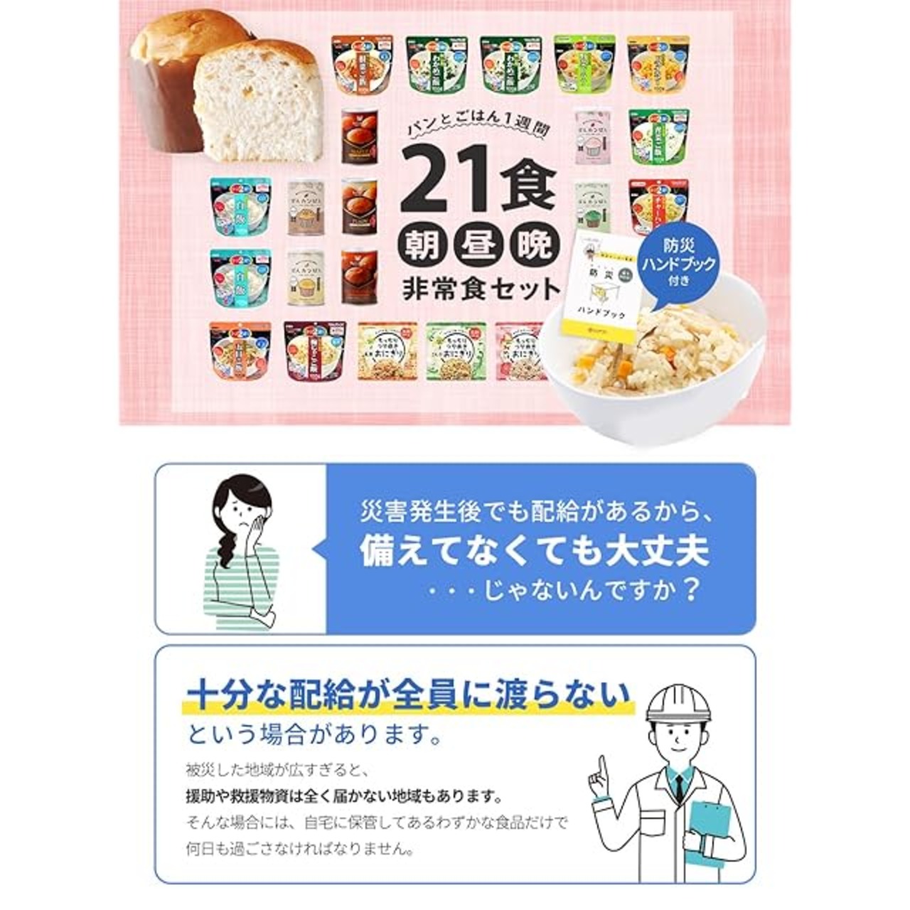 商品名:非常食セット パン と ごはん 1週間 21食 [朝・昼・晩]の 保存食セット 7日分 保存食 非常食 災害用 アルファ米 おにぎり 防災セット 備蓄 防災グッズ