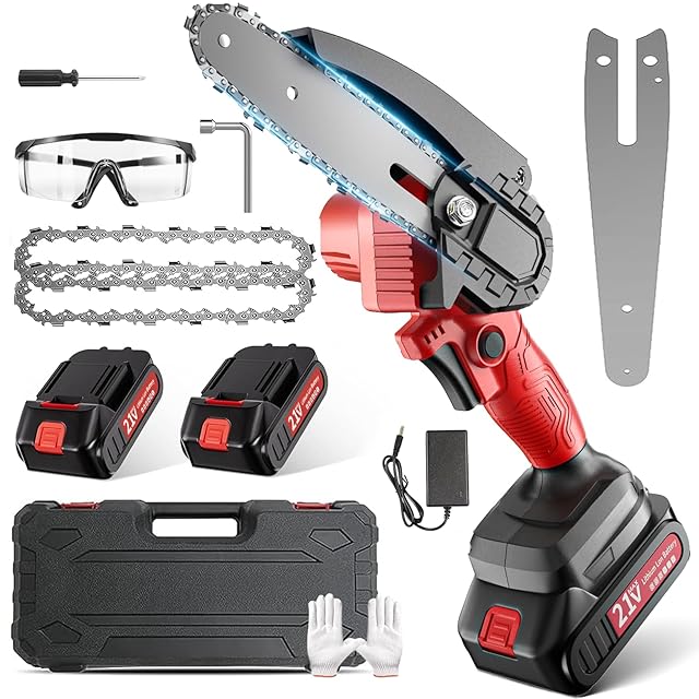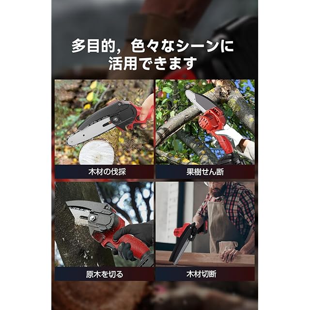 ?【大容量着脱式バッテリー2個】この充電式チェンソーコードレスで、配線に関する問題や危険性がないため、屋外での建設作業に非常に便利です。また、大容量の着脱式バッテリーが2個付属しており、バッテリー切れの際は簡単に交換できます。このチェンソーには、組み立て作業を簡素化するさまざまな付属品が付属しており、保管に便利な収納ケースも付いています。付属品:チェンソー×1、バッテリー×2、充電器×1、収納ケース×1、ドライバー×1、グローブ×1、ゴーグル×1、日本語取扱説明書×1、6インチチェン×1、6インチガイドバー×1。