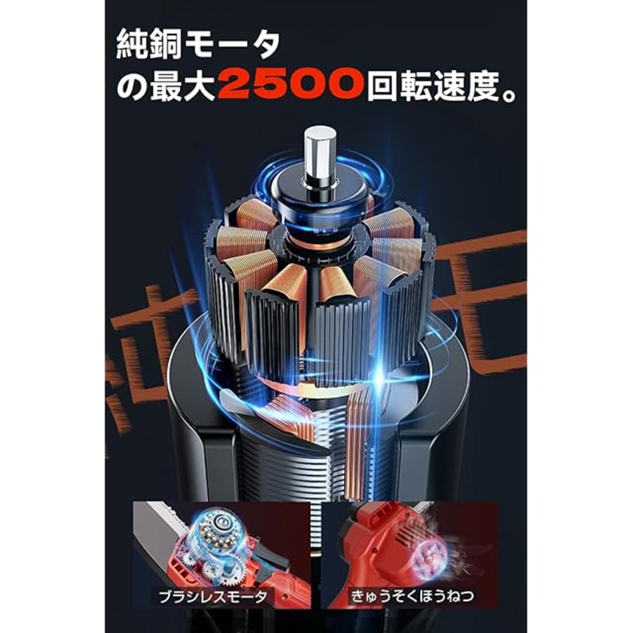 ?【高効率ブラシレスモーター搭載チェンソー】パワフルで効率的な切断性能を発揮するブラシレスモーターを搭載したコードレスチェンソー。強力 木工切断パワフルな純銅製モーターとシャープな高硬度チェンが最大320%長持ちし、出力は80%向上、消費電力は60%削減。出力550W、最高回転数2,500r/minで、直径15cmまでの木材を8秒以内に切断できます。薪、竹、枝も簡単かつ効率的に切断できる。ご注意:ガイドプレートは製品に一つしかありません、ご注意ください!