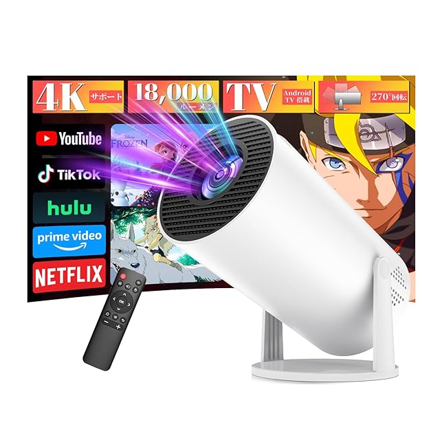 PliPla プロジェクター 家庭用【270°回転・18000LM・4K対応・Android TV搭載 最新登場! PSE認証済み】 プロジェクター 小型 高輝度 リアル1080P 天井投影 Wi-Fi6瞬間接続 Bluetooth5.4 HiFiスピーカー内蔵 自動台形補正 短距離投影 大画面 スタンド一体型 軽量 スマホ/パソコン/PS機など接続可 日本語取扱説明書 (ホワイト) | emishop315