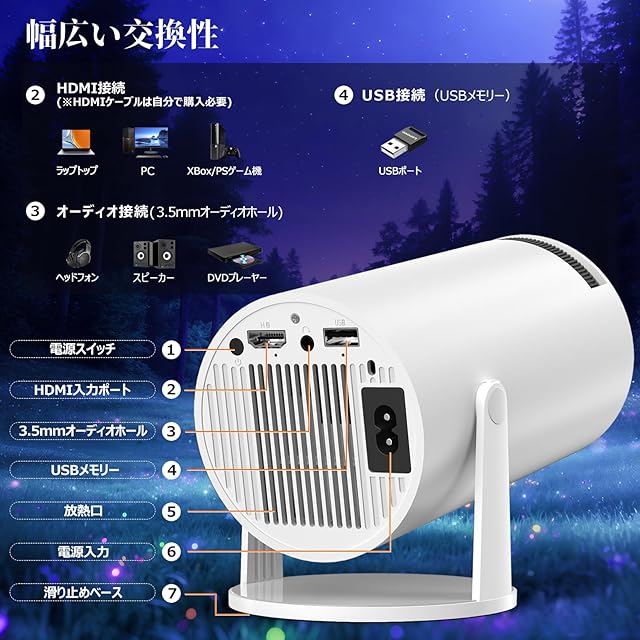 【幅広い互換性&80000Hの超長い寿命】Wi-FiとBluetooth接続に加えて、ミニプロジェクターはHDMI1.4、USB、3.5mmオーディオポートも装備しており、PC、DVDプレーヤー、タブレット、USBストレージ、PSゲーム機、スピーカー、ヘッドフォンなどと互換性があります。 また、独自開発の循環冷却システムにより80,000時間以上の超長寿命を実現しており、安心してご使用いただけます。※HDMI インターフェースはバージョン 1.4 未満のデバイスに適していることに注意してください。(パッケージ内容:プロジェクター本体、リモコン(単4形乾電池×2本 ※別売り)、電源コード、日本語説明書) ご使用中に何かご不明な点がございましたら、お気軽に弊店ご連絡ください。