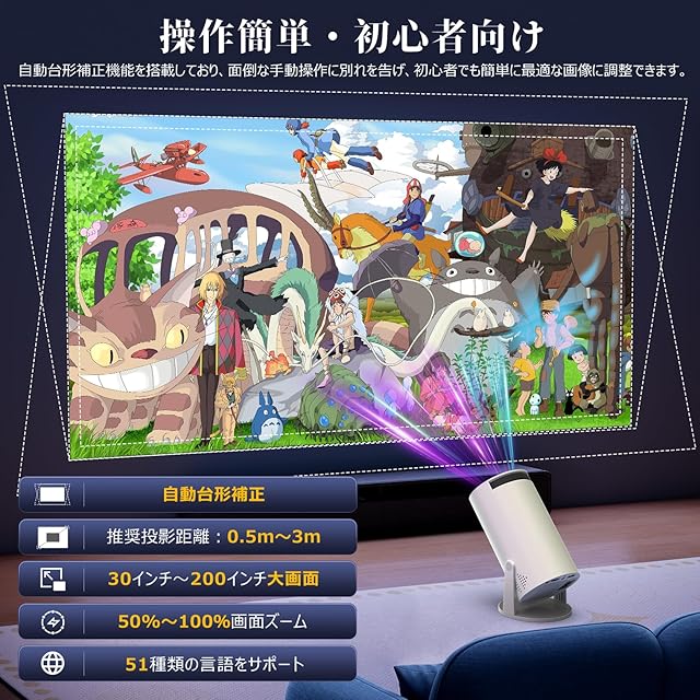 【Android TV&近距離投影&大画面】このホームプロジェクターはAndroid TVを内蔵しています。Wi-Fiに接続後、Prime Video、YouTube、TVer、Netflixなど8000以上のアプリから50万本以上の映画やテレビ番組をお楽しみいただけます。必要に応じてGoogle PlayやApp Storeから各種アプリをダウンロードし、家族や友達と一緒にお気に入りの映画やテレビ番組を視聴できます。また、0.5M~3Mの近距離投影が可能で、狭い部屋にも十分で、30インチ~200インチの大画面を手軽に楽しめます。※アプリケーションのバージョンがアップデートする場合もあり、元のアプリケーションをアンインストールし、App Store または Google Play から再度ダウンロードすればご利用できます。