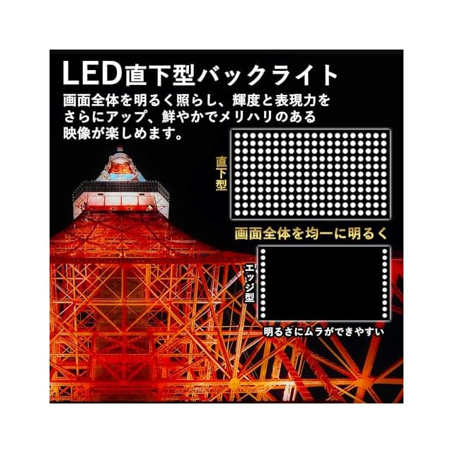 ?【VAパネル+直下型LEDバックライト】コントラスト比が高いVAパネルで、輝く光から漆黒の闇まで、明暗をより鮮やかに、より自然に表現します。さらに、直下型LEDバックライトで画面全体を明るく照らし、輝度と表現力をさらにアップ、鮮やかでメリハリのある映像が楽しめます。