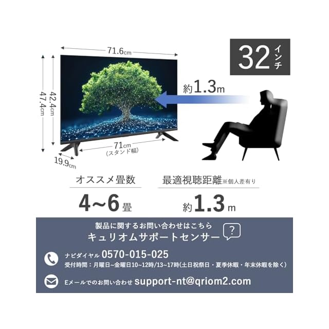 ?【商品仕様】◇本体寸法(幅×奥行×高さ):[スタンドなし]715.7×92.9×424mm [スタンドつき]715.7×198.6×474.2mm ◇本体質量:[スタンドなし]3.7kg [スタンドつき]3.8kg ◇画面サイズ:32V型 ◇解像度:1366×768 ◇コントラスト比:3000:1 ◇視野角(最小値):左右=約178°/上下=約178° ◇応答速度:6.5ms ◇音声出力(スピーカー):5W+5W ◇チューナー:地上デジタル×2、BS、110度CSデジタル×2(ダブルチューナー)※1つは視聴専用・2番組同時録画は非対応 ◇壁掛け寸法:VESA規格100×100mm ◇定格電源:AC100V(50/60Hz) ◇消費電力:50W ◇HDMI:HDMI Ver.1.4a×2 CEC機能に対応※HDMI入力1のみARCに対応 ◇USB端子:USB2.0×2 ◇付属品:リモコン、リモコン用単4形乾電池×2(動作確認用)、miniB-CASカード、miniAV交換アダプター、スタンド、スタンド固定ネジ×4、書付き取扱説明書