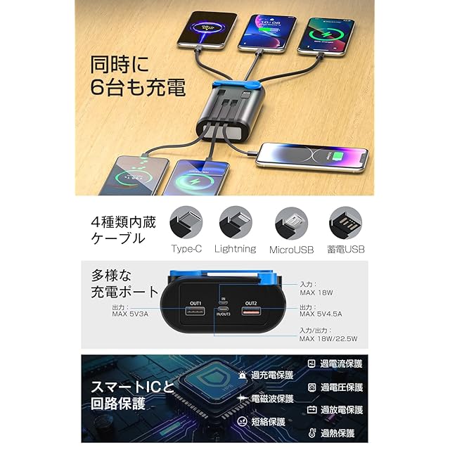 【四つのケーブル内蔵&最大6台同時充電可能】Type-CやmicroUSBなど向けの3規格出力ケーブルとUSB-Aケーブル(入力)が内蔵されており、ケーブルを持ち忘れたときもバッテリー本体へ蓄電できます。4ケーブル内蔵と3個USB出力ポートがあるので、最大6台同時充電が実現され、家族や友人と旅行に行った際や出張時、複数のスマホやデバイスの充電が必要な時でもこの一台で十分です。4つのLEDインジケーターにより、バッテリー残量と蓄電状況が分かりやすくなります。