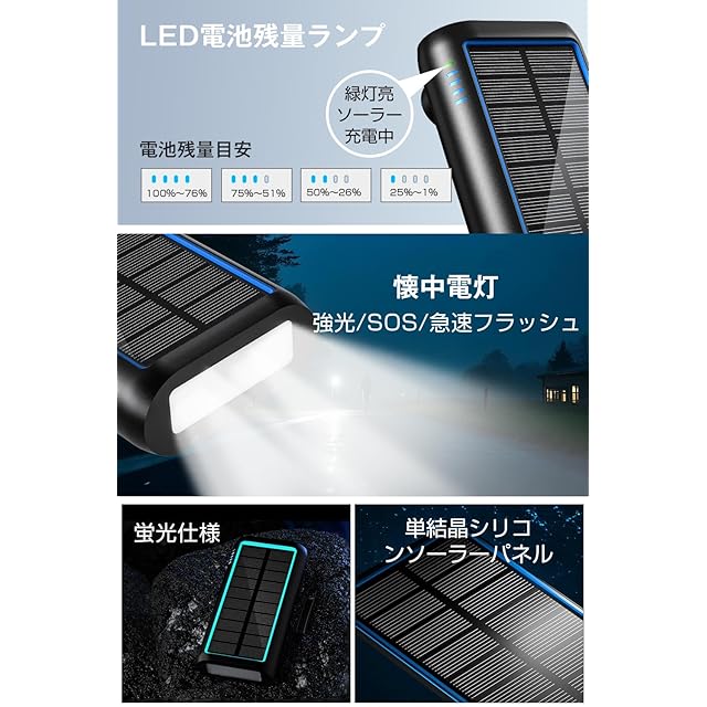 【LEDインジケータ付き&高輝度の懐中電灯&&SOS発信機能】4つのLEDインジケーターにより、バッテリー残量と蓄電状況が分かりやすくなります。高輝度LEDランプを採用され、LEDランプの光を広く均一分散されて、LEDライトは高輝度照明、フラッシュとSOS緊急発信3つのモードがあります。フル充電されると、連続点灯が可能で、地震、台風、災害、夜道時に最適で、野外の暗い場所でも利用されていただいております。緊急時にも、LED懐中電灯、SOS信号灯として利用できます。