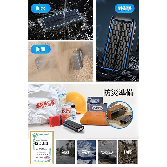 【パッケージ内容&PSE技術認証済】 ソーラーモバイルバッテリー本体 ×1、充電ケーブル(Type-C) ×1、取扱説明書×1。過充電、過放電、過熱、短絡保護などの多重保護機能を搭載しており、安全性に優れています。本製品はPSE認証を取得し、厳格な安全基準をクリアしています。。商品の使用中に万が一不具合のようでしたら、お気軽にご連絡ください。また、何かご不明がございましたら、お気軽にお問合せ頂ければ幸いです。