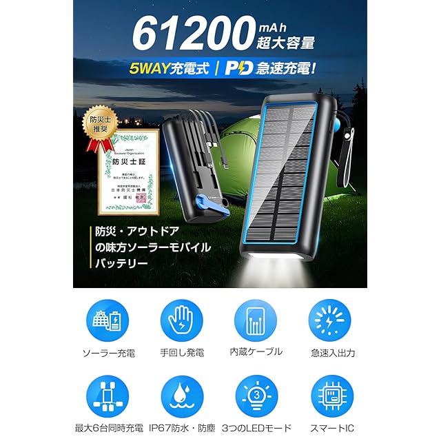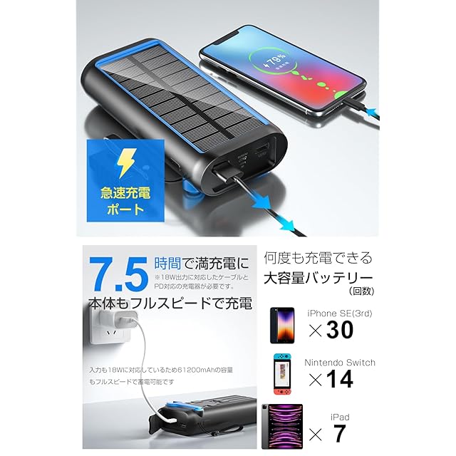 商品名:ソーラーモバイルバッテリー 手回し充電 【2025新登場 & 急速充電・22.5W/PD18W 】 ソーラーチャージャー 61200mAh 防災士監修 4本ケーブル内蔵 Type-C モバイルバッテリー ソーラー IPX7防水 耐衝撃 携帯 スマホ充電器 LEDライト付き 停電対策 SOSモード 地震/災害/旅行/アウトドア iPhone/Android各種デバイス対応 (ブルー)