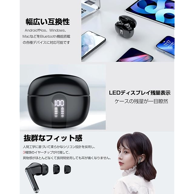 【快適なフィット感&コンパクト軽量】人間工学に基づいて柔らかなシリコン設計を採用し、3種類のイヤーチップ(S/M/L)が付属して、異物感がほとんどなくて、耳の形に合わせて遮音効果も両立しています。片耳が4.1gなので、羽のように軽く、耳に負担がかけなく、長時間装着していても耳が痛くなりません。?充電ケースの重量41gと、軽量・小型化を実現し、持ち運びにも便利です。外出時にポケット、カバンに入れることができますので、セットでどこに持ち歩いても邪魔になりません。