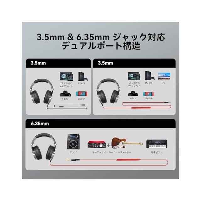 【幅広い互換性】変換アダプタ不要!3.5mm-3.5mmプラグのマイク付きケーブルと3.5mm-6.35mmプラグのカールケーブル付きが付属。スマホ、PC、DJミキサー、アンプ、電子ピアノ、エレキギター、キーボードなど、3.5mm/6.35mm端子を搭載したあらゆるオーディオ機器と互換性があります。