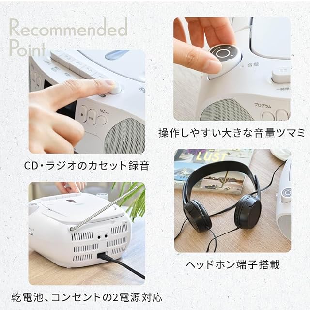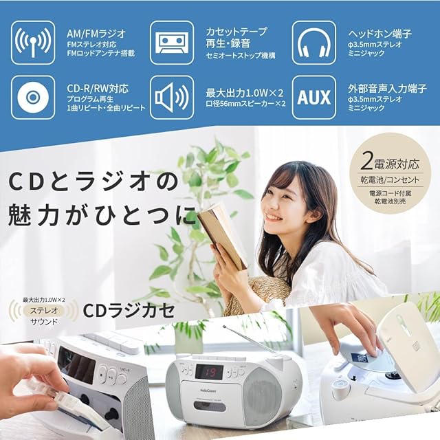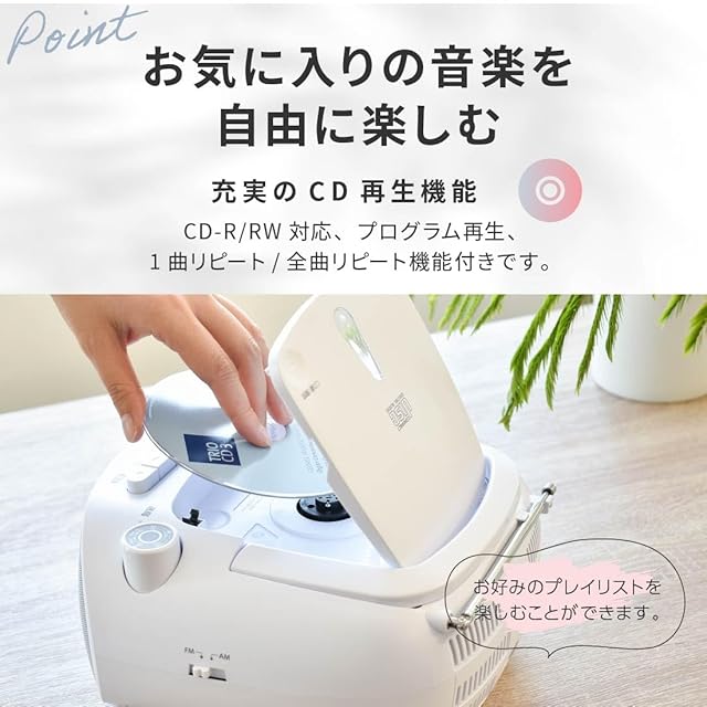 ◆ワイドFM(FM補完放送)対応 ◆CD-R/RW対応、プログラム再生、1曲リピート/全曲リピート機能付き ◆ヘッドホン端子搭載(φ3.5mmステレオミニジャック) ◆AUX(外部音声入力)端子搭載(φ3.5ステレオミニジャック) ◆乾電池、コンセントの2電源対応 ◆電源コード付属 ◆本体カラーはホワイト
