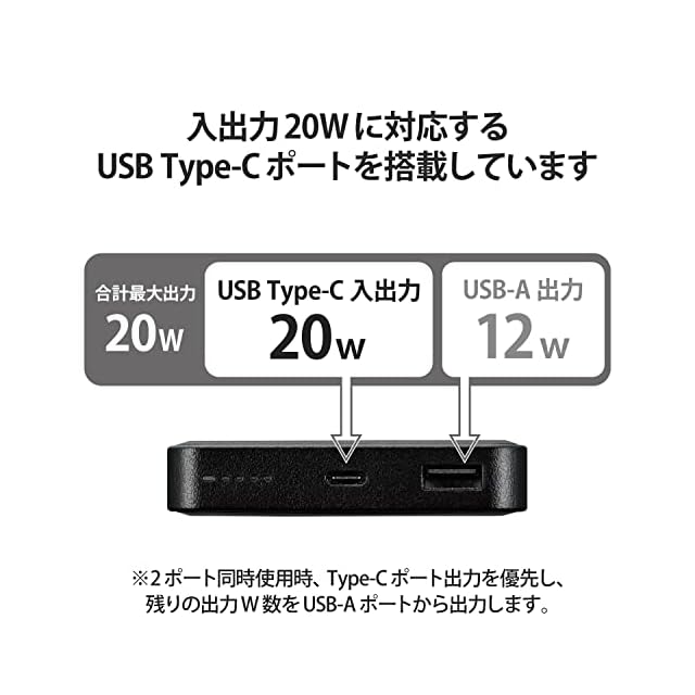 USB-Aポート、USB Type-C(TM)(USB-C(TM))ポートをそれぞれ1ポートずつ搭載しており、2ポート合計20Wの出力が可能な高出力モデルです。