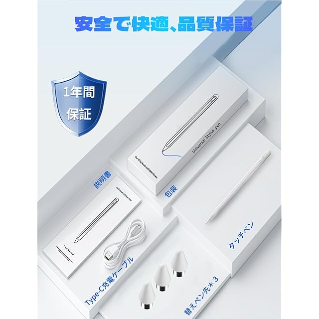 【付属品と専門的なアフターサービスを含む】androidタッチペンの内容は取扱説明書、3つの交換用先端、充電ケー ブルが付属し、1年間のサービスを提供します。binoa storeの高品質なアフターサポートをご利用いただけます。【使いやすいipadペン】ペアリング不要のスマホスタイラスペンで、Bluetooth接続なしで簡単に操作でき、スイッチを軽く2回タッチするとON/OFFができます