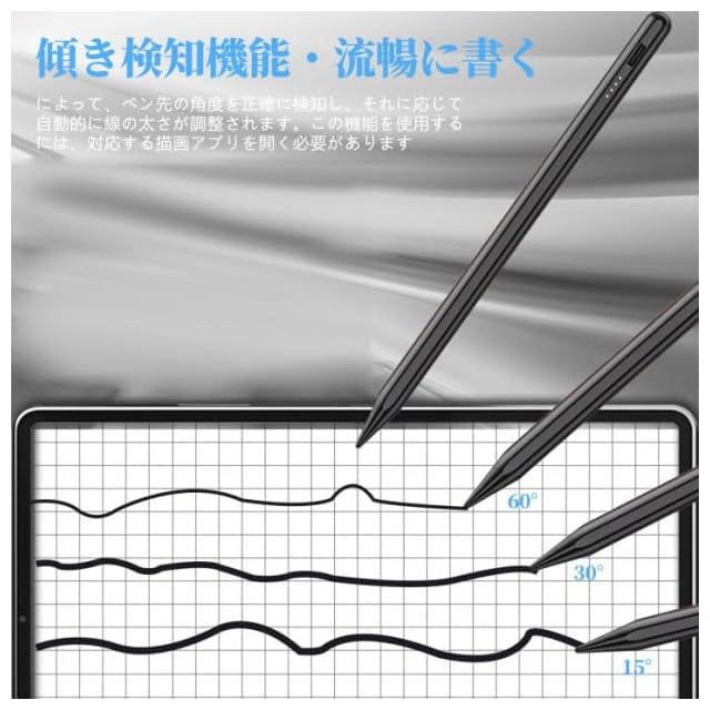 【軽量かつ耐久性のあるアルミ合金高品質素材】このタッチペンはアルミニウム合金製で、わずか12gの軽量設計。耐落下性と耐摩耗性の両立、軽量で持ち運びに便利。【傾き検知機能】によって、ペン先の角度を正確に検知し、それに応じて自動的に線の太さが調整されます。この機能を使用するには、対応する描画アプリを開く必要があります。【ご注意ください。】デバイスに貼られている強化ガラスフィルムは筆記に影響を及ぼす可能性があり、静電容量式の部品が正常に反応しないことがあります。ご使用の際は、フィルムを剥がしていただくことをおすすめします。【ご注意:Bluetooth に接続する必要はありません。ペンキャップをダブルクリックするだけで使用できます】