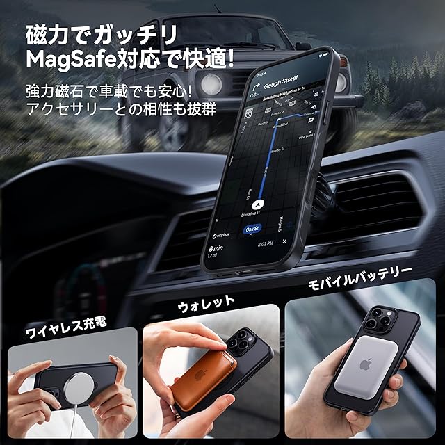 【世間を席巻したパワー・最大25W急速充電】内部に組み込まれた360度全周型のHalbach磁石配列により、業界屈指の強力な磁力を実現!これを通じて、スマホを確実に固定しながら、最大25Wの超高速ワイヤレス充電を提供します。車載ホルダーや鉄面に取り付けることで、どんな状況でも安定して使用でき。悪路での運転中や振動が激しい場面でも、スマホがずれる心配はありません。キッチンや浴室、外出時でも壁に取り付けてハンズフリーで動画視聴が楽しめます。N56マグネット磁石の圧倒的な吸着力で、どんな環境でも安心して利用できる万能なケースです。対応機種:iPhone16 pro ケース