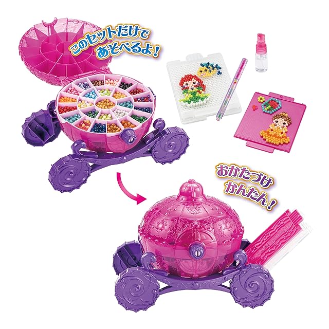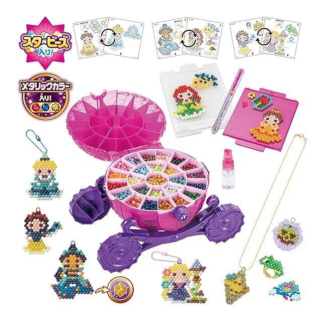 かわいいキャリッジ型ケースつきでビーズや作品、アクセサリーパーツを収納できます。メタリックカラービーズでプリンセスたちのドレスもきらめきアップ!