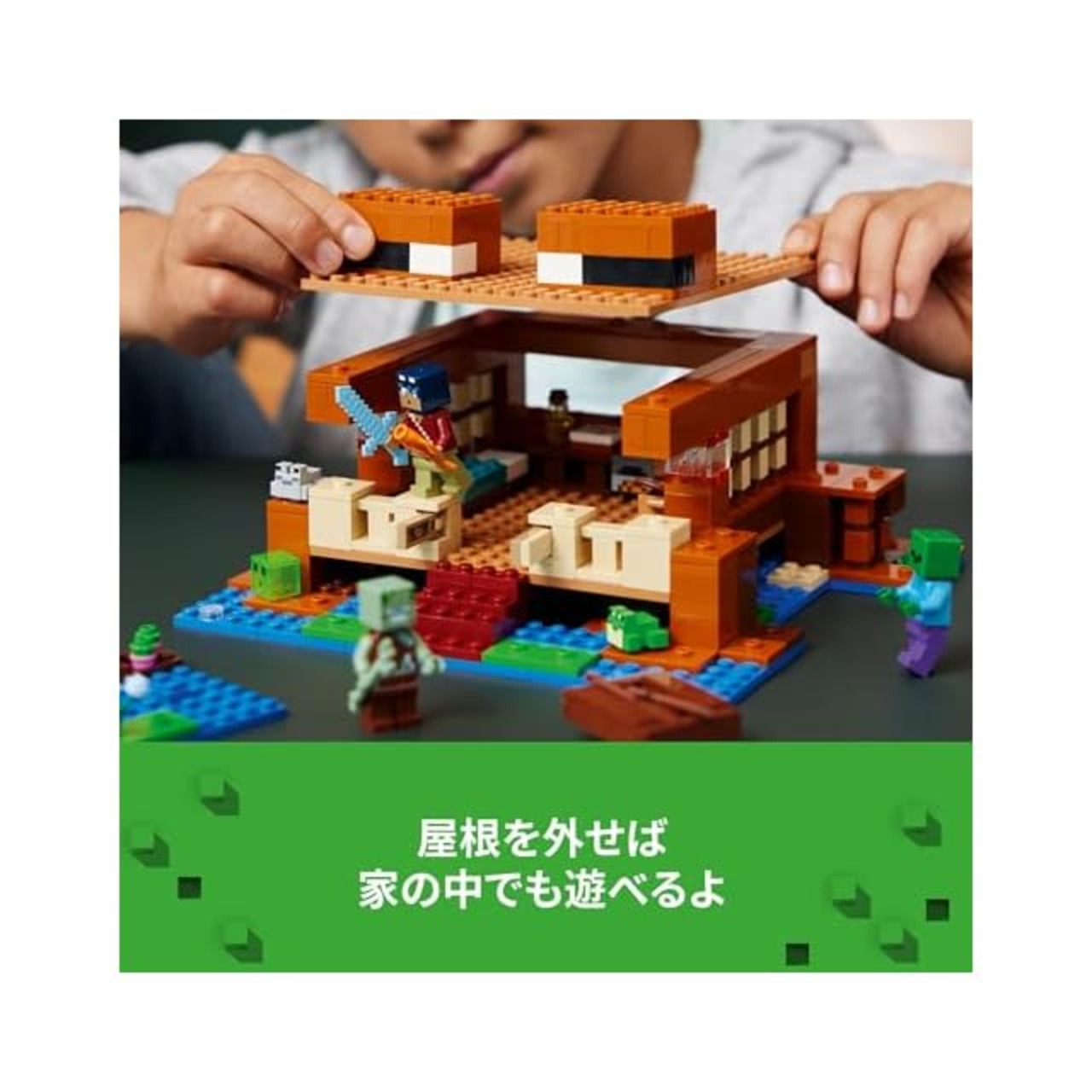 マインクラフト フィギュア付き ? 組み立て式のカエルハウス セットには、湿地帯の冒険者1体、ゾンビ1体、溺死ゾンビ1体、スライム1体、カエル3体のフィギュアが付属