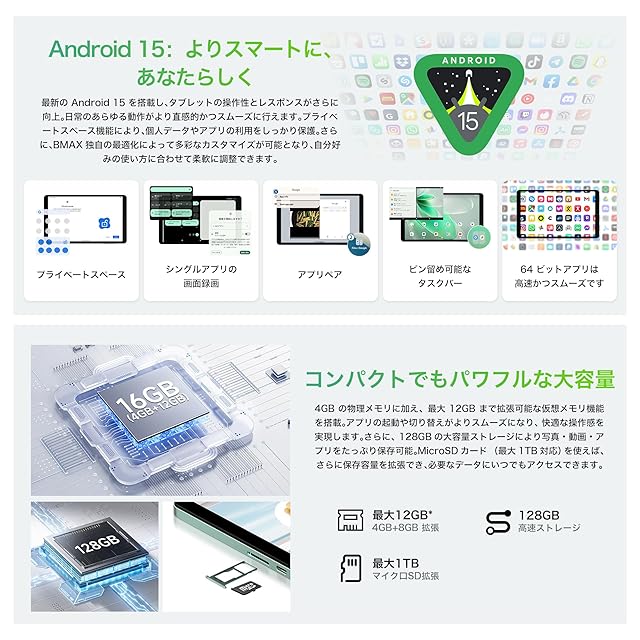 【Android 15 タブレット 8インチ初登場】Bmax I8 Plus 8インチ タブレットは最新Android15 OSを搭載し、64ビットAPPアプリケーションに深く最適化され、起動と応答速度が向上しています。 また、弊社の二次開発では、システムUIの一部が改善・最適化され、より多くのサードパーティ製アプリケーションに適応し、システムインタラクションがよりフレンドリーで便利になりました。プライベートスペース:機密性の高いアプリやデータを見えないようにします。アプリのペア:最もよく使用するアプリをペアリングすることで、タップでマルチタスクを実行します。また、単一アプリの画面録画、16GBメモリーページング・サポートなど、他のアンドロイド15の新機能も搭載している。アンドロイド15タブレットI8 PLUSは、自信を持って探索し、道を発見するのに役立つ新機能を提供しています。