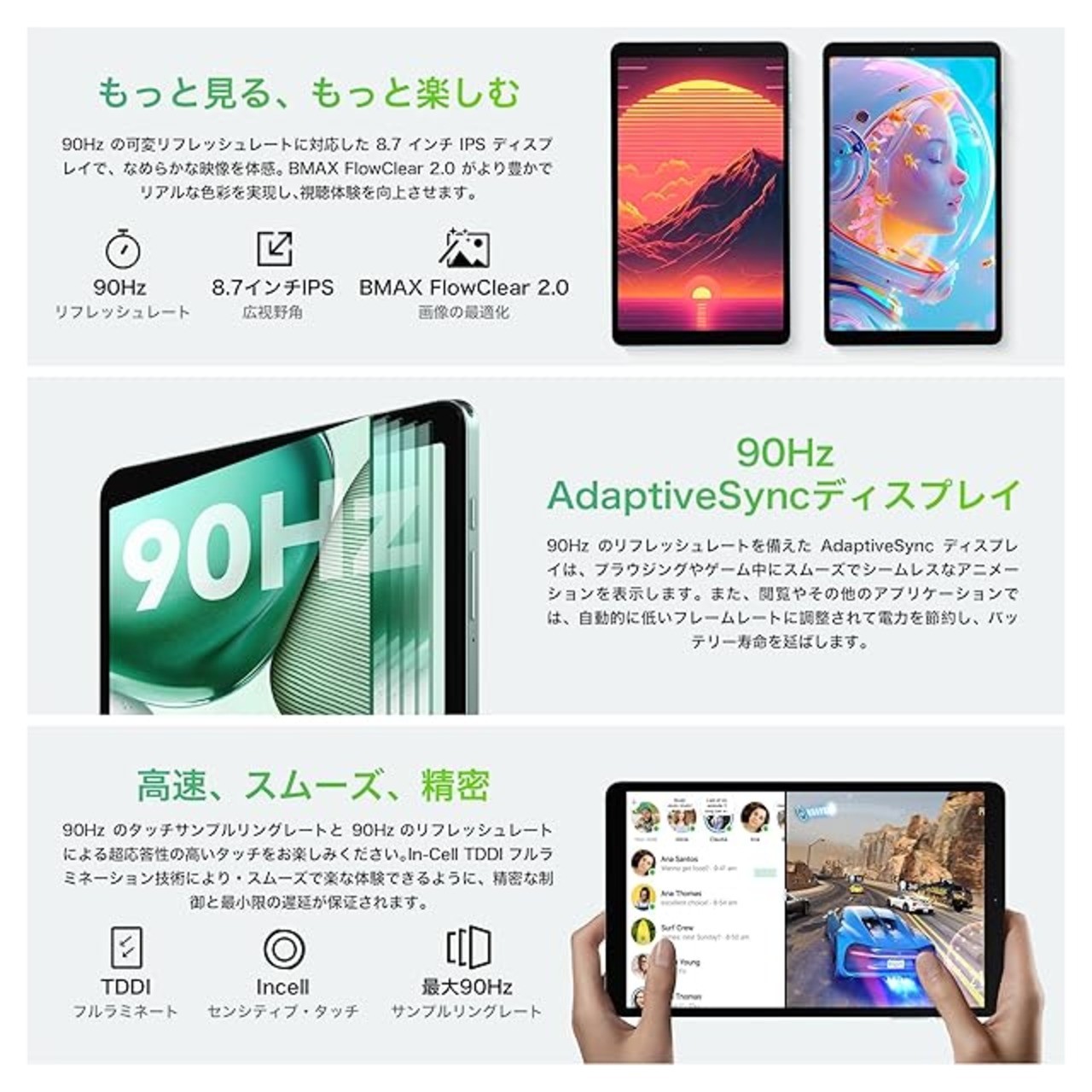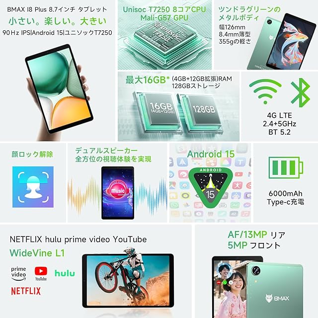 商品名:【タブレット 8インチ Wi-Fi/SIM通話モデル】Bmax I8 Plus Android15 タブレット、16GB+128GB+1TB拡張、8コアCPU T7250 、90Hz高刷新率8.7インチ Tablet、4G LTE+GPS搭載、6000mAh+Type-C充電、Widevine L1対応+無線投影、5GWiFi+BT5.2+OTG、顔認識+画面分割+児童保護+FMラジオ