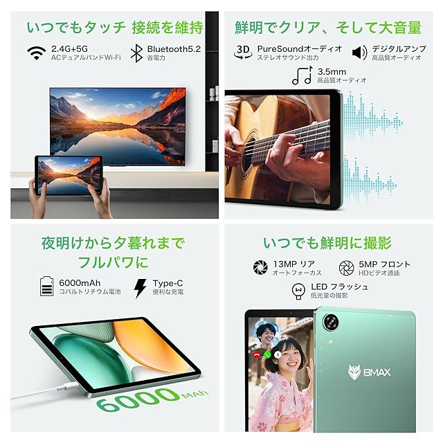 【高級感の外観 タブレットPC & AIカメラ13MP/5MP & 2つのスピーカー & 品質】より良い外部リスニング体験をもたらすために、タブレット8インチにはサウンドキャビティ2つのスピーカー、すべてのオーディオの詳細を真剣に受け止め、高周波は大音量で低音です周波数フルで繊細で活気のある、トーンはより純粋です。BMAX I8 Plus タブレット は8.4mm の薄さ、重量約355gで、ポータブルなオールメタルデザイ、片手で握りやすい8.7インチタブレットです、仕事・勉強・外出先など、持ち歩きにも便利です。1300万画素のリアカメラと500万画素のフロントカメラを内蔵している為、高品質な写真とビデオを撮影できます。更に、PSE、CE、FCC & TELEC 認証取得。本商品は、無線機器電波法令の技適マークとGMS認証も取得しております。☆一年間の品質保障期間があり、メール(英語や日本語サポート)にも対応しております。質問がございましたら、商品ページに「カートに入れる」ボタンの下に店舗名をクリックし、右上の「質問する」からメールで当店に連絡が可能です。