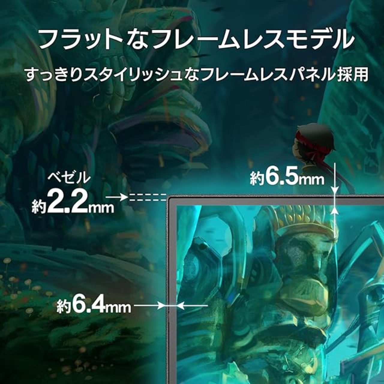 【フレームによる段差がなく、フラットなフレームレスモデル】パネルとフレーム(枠)による段差がないフラットなフレームレスパネルを採用しました。わずか約2.2mmの極細フレームですっきりした印象を与え、マルチディスプレイにもオススメです。スタイリッシュなデザインの液晶ディスプレイは、オフィスにも自室にもマッチします。