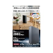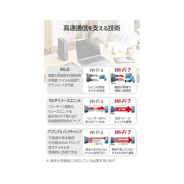 ■無線伝送速度[802.11be(draft)](理論値):IEEE 802.11be(draft):5GHz帯 最大2882Mbps 2.4GHz帯 最大688Mbps(※) ※受信は最大574Mbps、送信は接続機器が4096QAM通信対応の場合、最大688Mbps