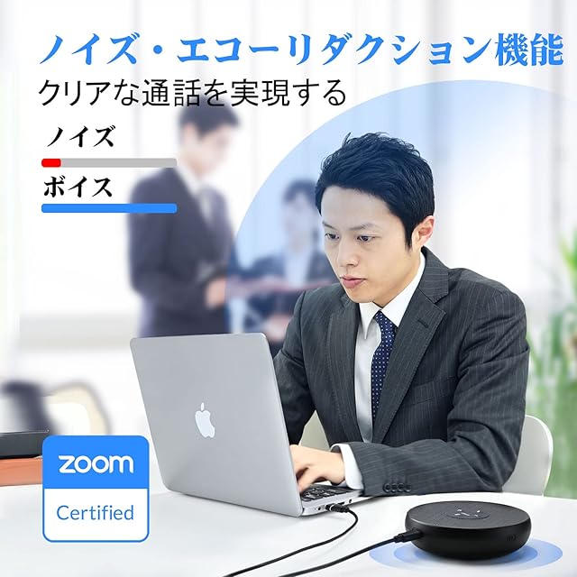 【優れた音声処理機能】エコーキャンセリングや残響抑制、ノイズリダクション機能を採用しており、クリアな通話を実現できたスピーカーフォンです。周囲の雑談の音、コピー機・エアコンのノイズ、キーボード打ちの音などを抑制でき、発言者の音を明瞭に展開できます。ストレスのないオンライン会議をサポートします。高品質な通話をする「Zoomミーティング」の公式認証を取得し、製品本体のミュートボタンとZoom上のミュート表示が連動するようになります。