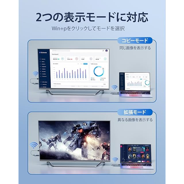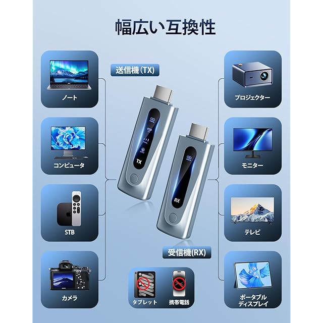 ?【2つの表示モードで柔軟に活用&多様なデバイスに対応】HDMI無線送受信機セットはコピーモードと拡張モードの2つのモードをサポートしており、異なる使用シーンに応じて柔軟に対応できます。コピーモードでは画面の内容が完全にターゲットデバイスに複製され、同じ内容が表示されます。拡張モードでは、異なる内容をターゲットデバイスとの間で表示することができます。また、さまざまなデバイスと互換性があり、送信機(TX)はカメラ、Switch、Xbox、PS4、ノートPC、PCなどのデバイスをサポートしており、受信機(RX)はWindows、TV、Mac OS、プロジェクターなどのデバイスをサポートしています。WEB会議やリモート会議、プレゼンテーションなどのビジネス用途はもちろん、ご自宅での部屋間の映像転送など、幅広いシーンで活躍します。(ご注意:送信機はスマホ、ipadに対応できません。)