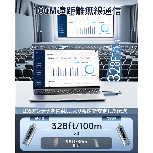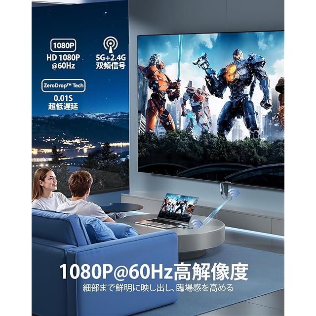 ?【5G + 2.4Gデュアルバンド信号 & 1080P@60Hz解像度 & 100m長距離伝送】?最大で1080P@60Hzの解像度をサポートし、60Hzのリフレッシュレートは臨場感あふれる視聴体験をもたらし、オフィスプレゼンテーションだけでなく、ゲームや映画などエンターテインメントにも適しています。?5G + 2.4G無線デュアルバンド信号、電波干渉に強く、途切れることのない安定した高品質な信号伝送を実現します。?最大100メートルの伝送距離と0.01秒の超低遅延(ご注意:障害物のないオープンな環境では最大100メートル。実際の伝送距離は環境によって異なる場合があります。)弊社の製品は非常に信頼性が高く、安定した性能を提供し、高解像度で鮮明なビデオとオーディオ、安定した信号、鮮やかな色彩、快適なノイズのない視聴体験を楽しめます。