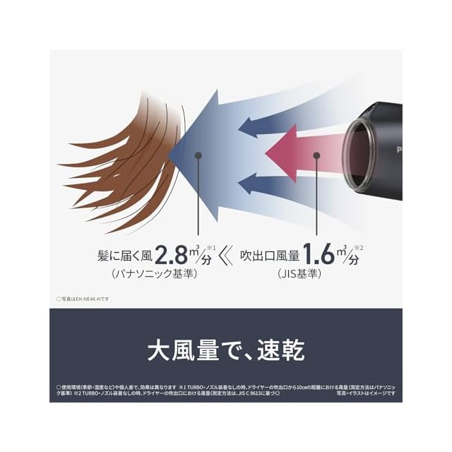 1.6?/分(※TURBO・ノズル装着なしの時※)自社基準2.8?/分(※TURBO・ノズル装着なしの時、ドライヤーの吹出口から10cmの距離における風量。測定方法は自社基準。※)の大風量でパワフルドライ。
