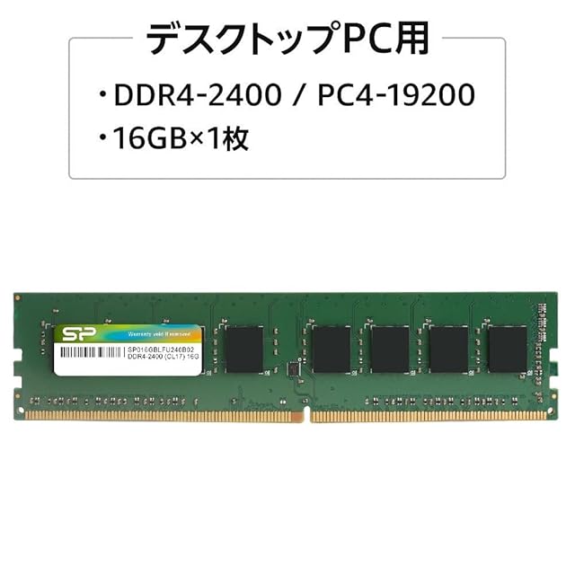 商品名:シリコンパワー デスクトップPC用メモリ DDR4-2400(PC4-19200) 16GB×1枚 288Pin 1.2V CL17 SP016GBLFU240B02