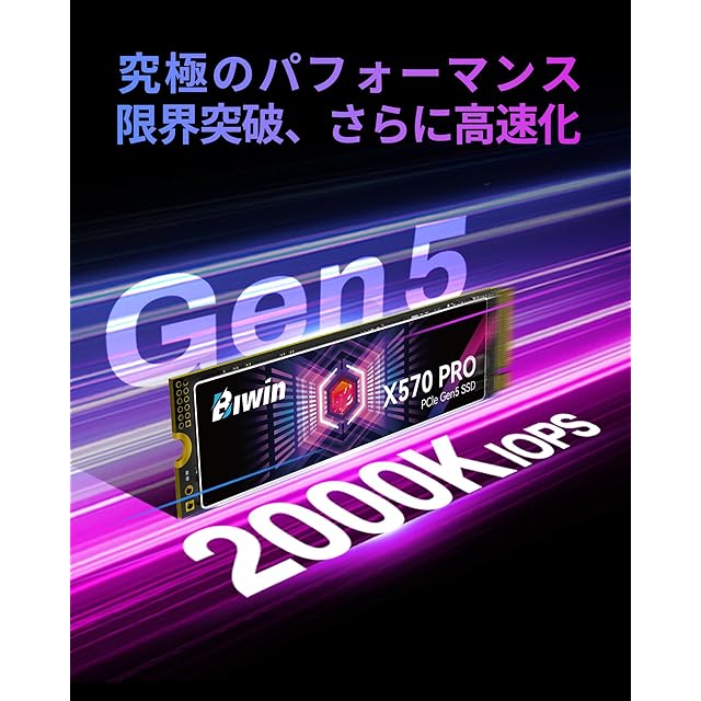【Biwin X570 PRO】Biwin X570 PROは、究極の高速を求めるパワーユーザー向けに設計された第5世代M.2 SSDです。従来のGen4 SSDと比較して、最大2.5倍の読み取り速度と最大5倍の書き込み速度を実現。ゲーミング、コンテンツ制作、AIトレーニングなど、負荷の高い作業においてもデータ転送のボトルネックを解消し、システム全体の性能を最大限に引き出します。