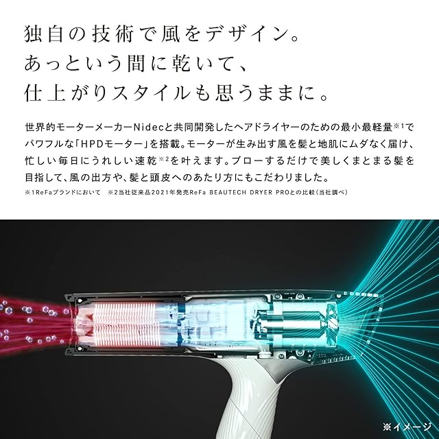 【最小最軽量※のパワフルなモーター】世界的モーターメーカーNidecと共同開発したヘアドライヤーのための最小最軽量※でパワフルな「HPDモーター」を搭載。 ※ ReFaブランドにおいて