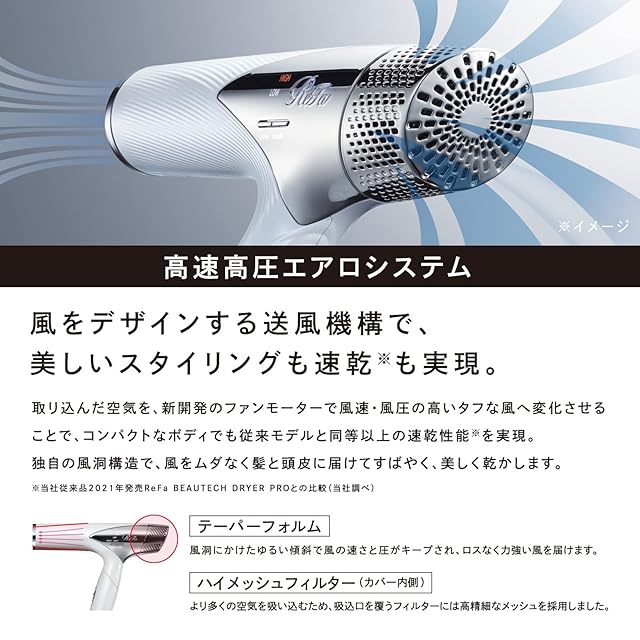 【高速高圧エアロシステム】取り込んだ空気を、新開発のファンモーターで風速・風圧の高いタフな風へ変化させることで、コンパクトなボディでも従来モデルと同等以上の速乾※性能を実現。独自の風洞構造で、風をムダなく髪と頭皮に届けてすばやく、美しく乾かします。 ※ 当社従来品2021年発売ReFa BEAUTECH DRYER PROとの比較(当社調べ)