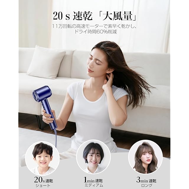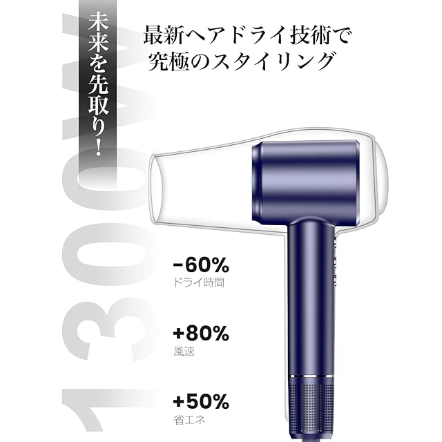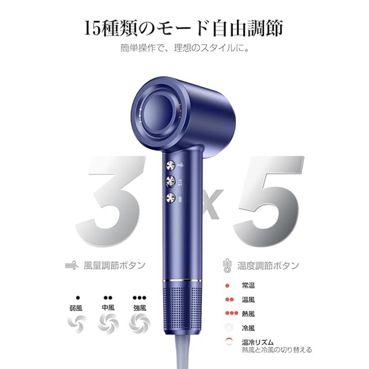 商品名:ドライヤー【2025進化モデル・20s速乾】大風量 高速ヘアドライヤー 2億高濃度マイナスイオン 静電気抑制 NTC温度制御システム 過熱保護 恒温ヘアケア 髪質改善 5段階温度調節&3段階風量 【温冷リズム】 マグネット式ノズル付き 小型 コンパクト 静音 軽量 旅行/サロン/家庭用/プレゼント PSE認証済み ネイビー