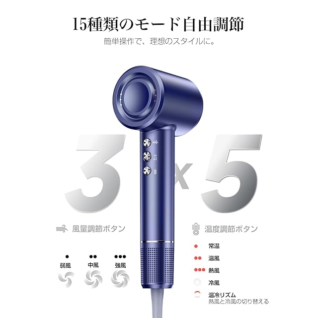【3段階風量調節&5段階温度調節で、髪に最適なケアを実現】強・中・弱の3段階風量と、冷風・常温・温風・熱風・温冷リズム5段階の温度調節を搭載。さらに、温冷リズムモードで頭皮の健康をサポートし、髪質やスタイルに合わせた最適な設定が可能です。どんなシーンでも、プロのような仕上がりを簡単に叶えます。「温冷リズムモード:3秒長押し冷温熱風交替,赤色灯交替点滅」