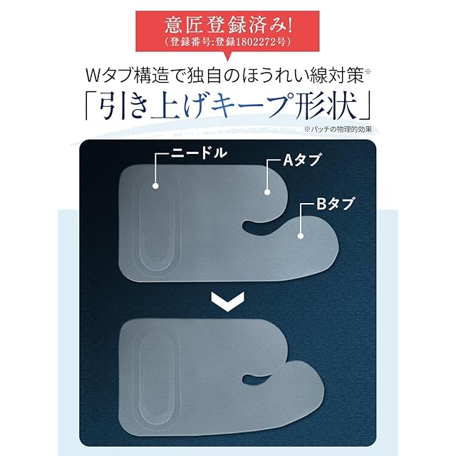 【ヒミツ その1】 ほうれい線をピンッ!と伸ばす* 2つのタブが付いた独特な形状がポイント。 これによってほうれい線のシワをピン!と伸ばす*ことが可能に! *パッチの物理的効果