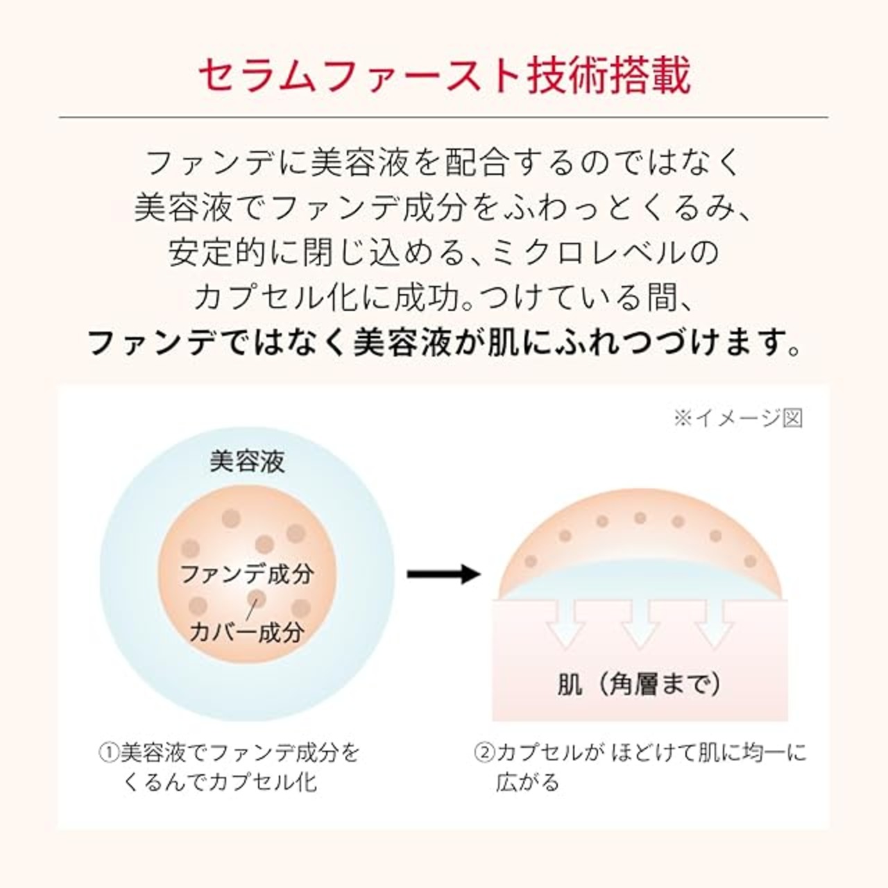 【セラムファースト技術搭載】ファンデに美容液を配合するのではなく美容液でファンデ成分をふわっとくるみ、安定的に閉じ込める、ミクロレベルのカプセル化に成功。つけている間、ファンデではなく美容液が肌にふれつづけます。